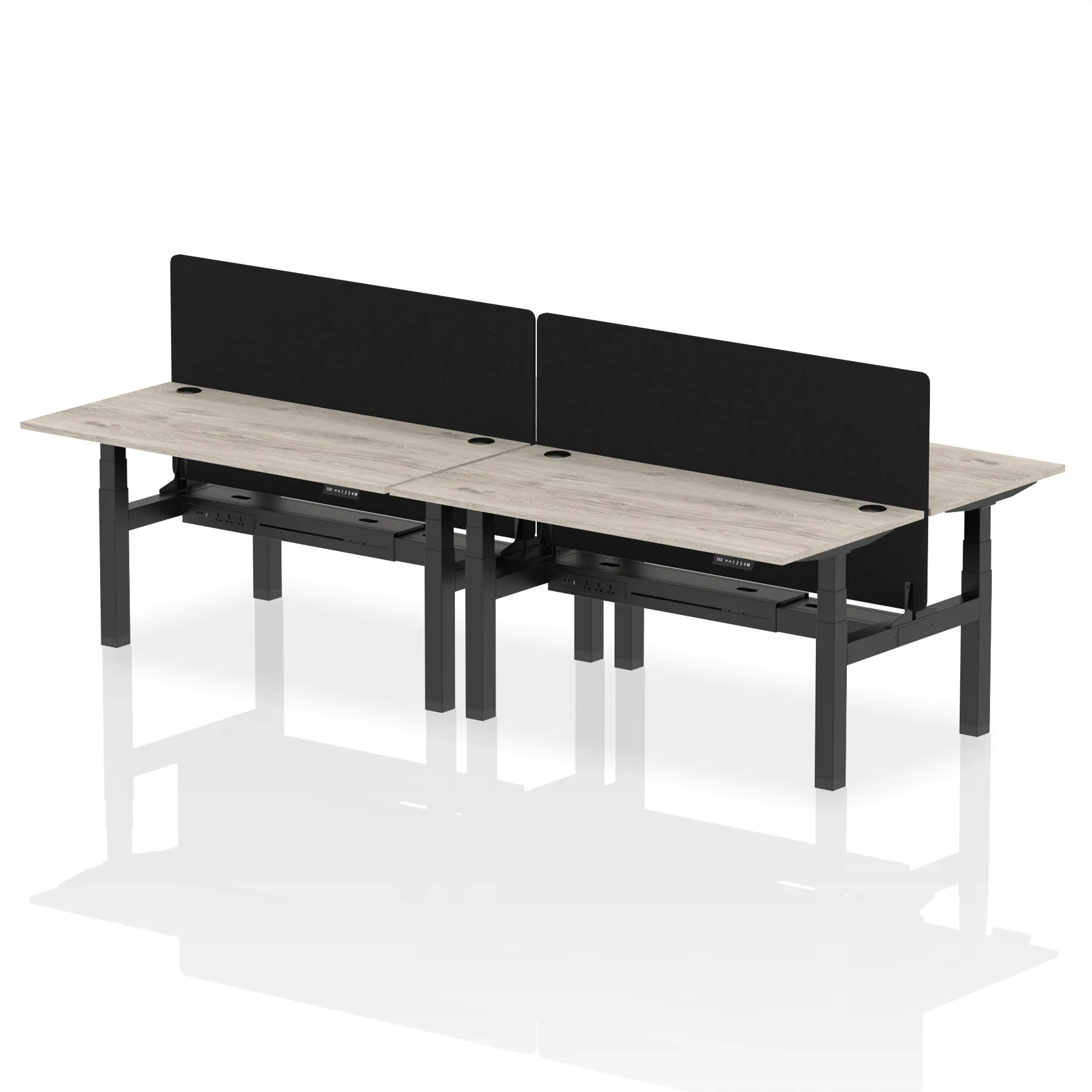 Elevate your office with the Air Back-to-Back Height Adjustable Desk for four, a blend of ergonomics and connectivity. Each desk includes two Ethernet ports, a USB and USB-C port, and three UK plugs, complemented by integrated cable ports for a clean setup. The addition of a dividing screen per duo offers privacy and focus. This desk is a perfect match for professionals seeking a tidy, tech-friendly, and adaptable workspace.