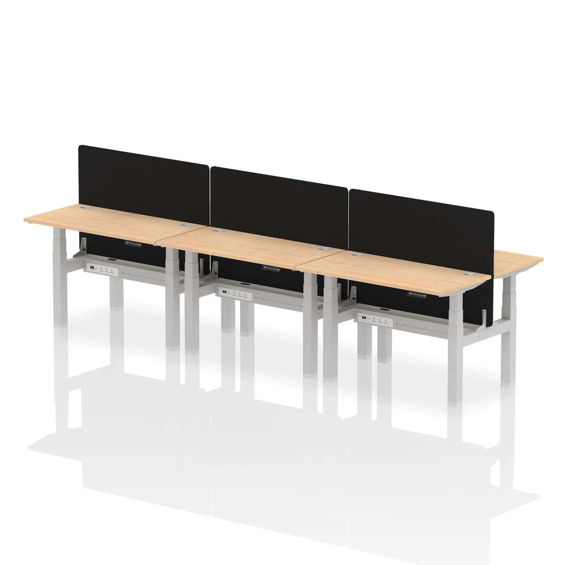 Meet the Air Back-to-Back Slimline Height Adjustable Desk, a sleek solution for six. Each workstation includes dividing screens, with two Ethernet ports, a USB port, a USB-C port, and three UK plugs per desk Cable ports ensure a clean, organized workspace. Its adjustable height promotes ergonomic comfort. Perfect for collaborative, tech-driven teams, this desk combines slim design with functionality for a modern, efficient office environment.