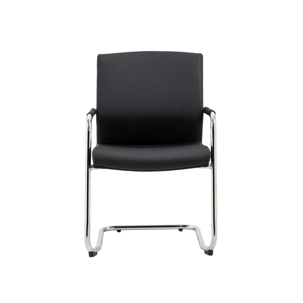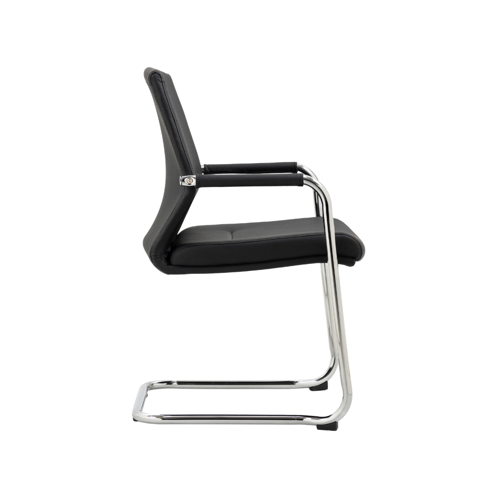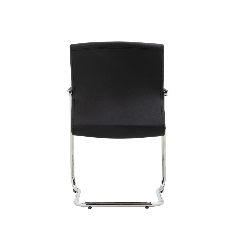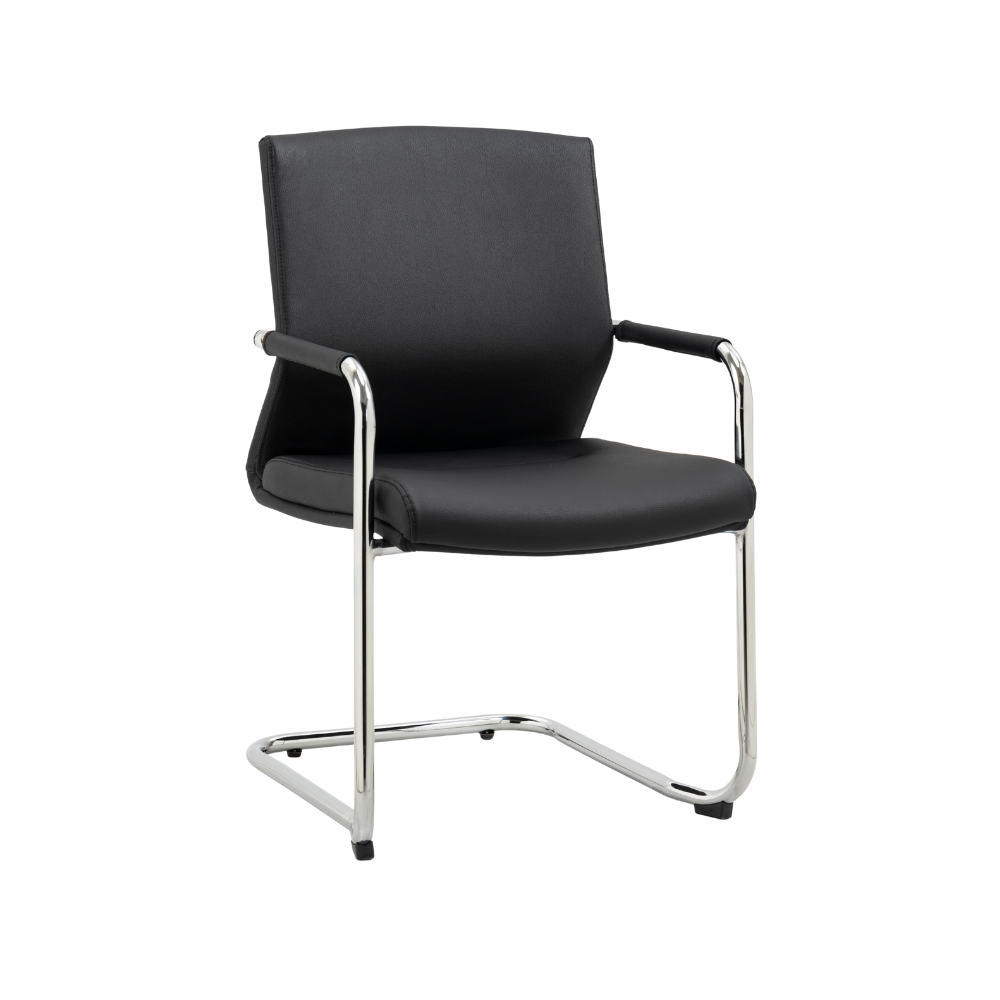 This High Back Meeting Chair combines a polished chrome cantilever frame with black faux leather upholstery to create a modern, executive look for your boardroom or reception area. Designed for guest comfort, it features high-density foam and a sculpted back that offers excellent lumbar support. The chair is engineered for stability, utilizing anti-tilt feet to prevent tipping, while the concealed arm fixings ensure a clean, seamless finish.