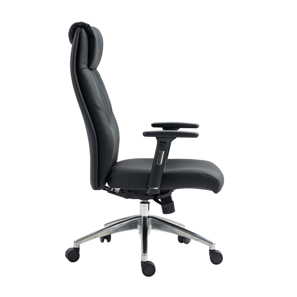 This chair brings a sleek, contemporary look to the executive office, upholstered exclusively in premium Black Faux Leather. Beyond its stylish appearance, it features a sophisticated mechanism with a 1:3 seat-to-back tilt ratio, ensuring that as you recline, the seat adjusts in perfect proportion to keep your feet planted and posture aligned. Supported by a polished aluminum five-star base with heavy-duty castors, this chair is built for both stability and dynamic movement.