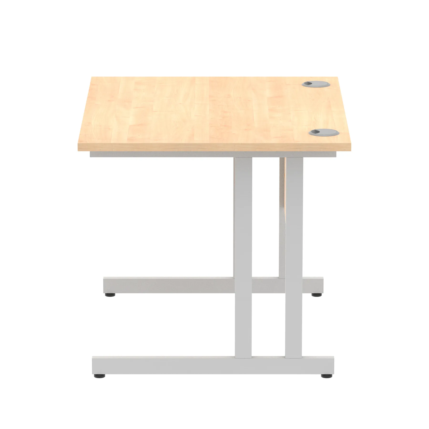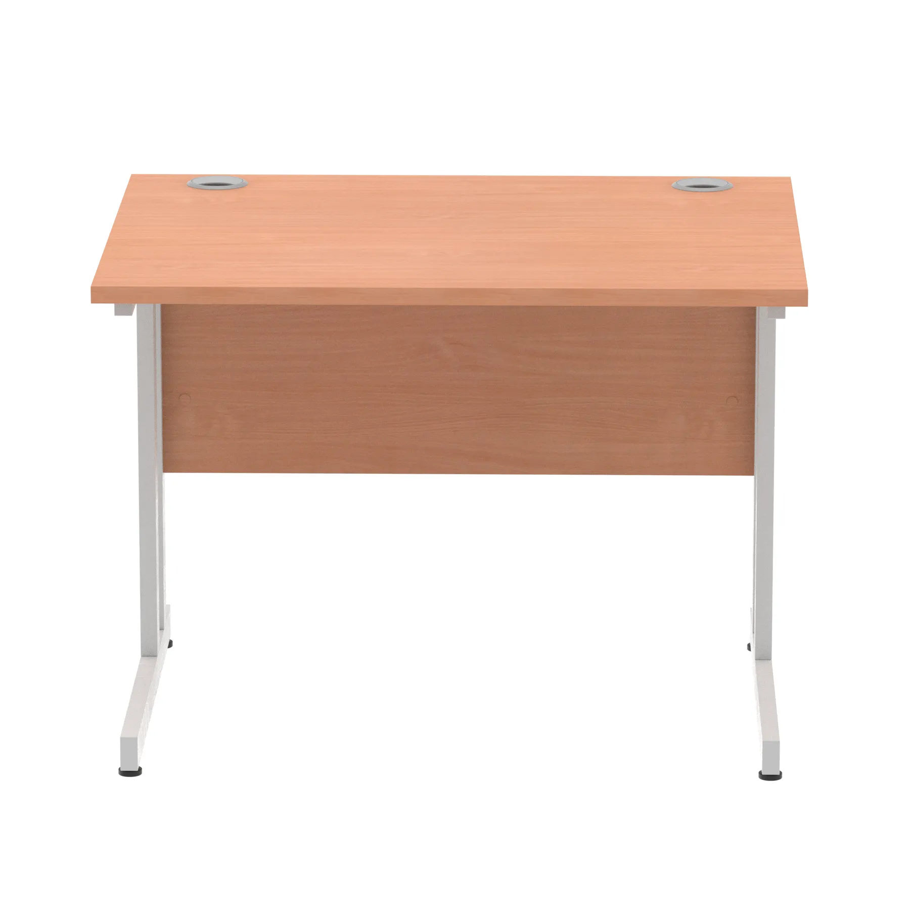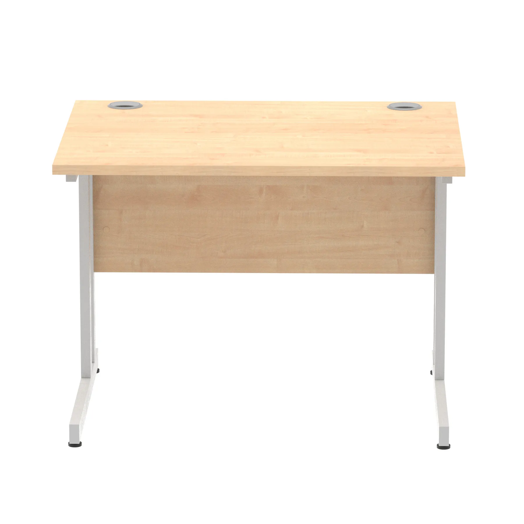 Impulse contract desk | 25mm tops | Heat resistant melamine finish | 18mm modesty panels | 2mm protective abs edging | Double strut legs | 2 cable ports | Height adjustable feet | Steel to steel fixings | 2 modesty panels slots| Deep set modesty panel (5″) allows for compatibility of most screen clamp fittings | Weight Capacity 135Kg