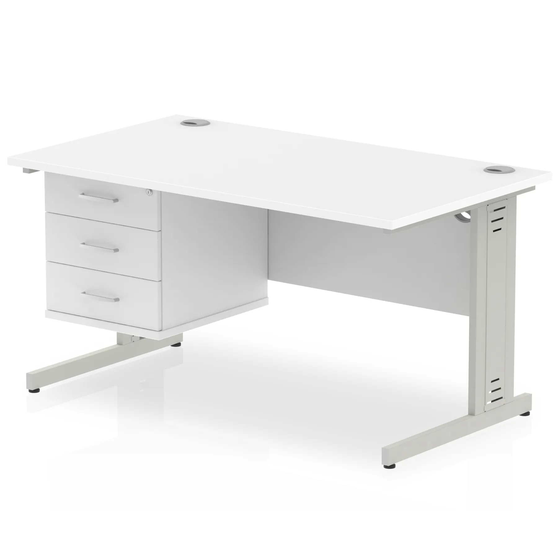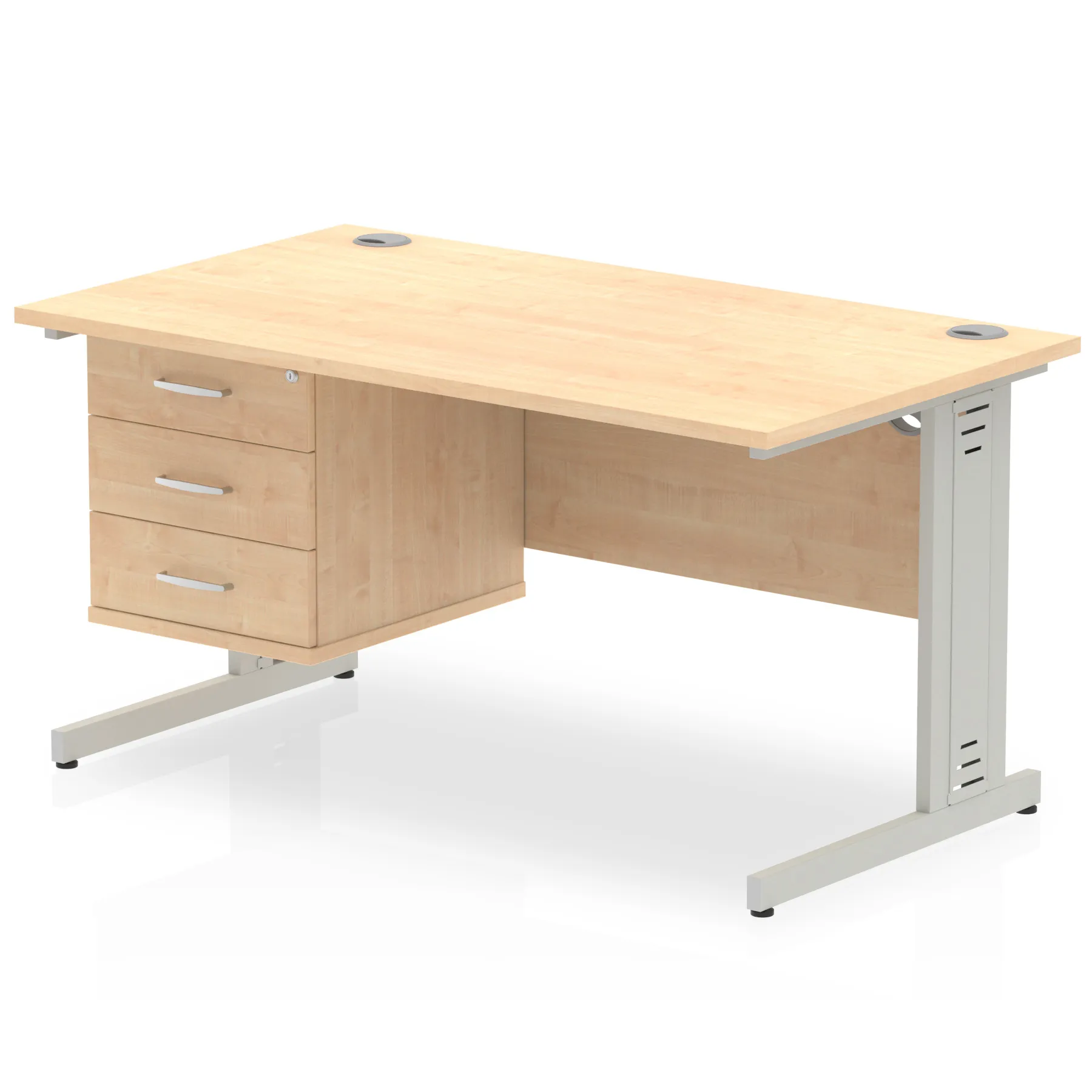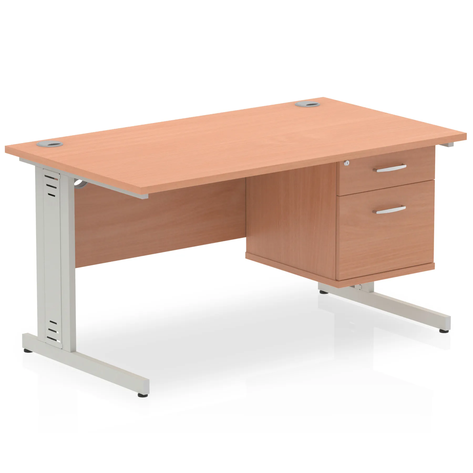 • Impulse contract 1400 wide desk • 25mm tops • Wire management panel • Heat resistant beech melamine finish • 18mm modesty panel • 2mm protective abs edging • Silver coated double strut legs • 2 cable ports • Height adjustable feet • Steel to steel fixings • 2 modesty panel slots • Deep set modesty panel (5”) allows for compatibility of most screen clamp fittings • Fixed pedestal