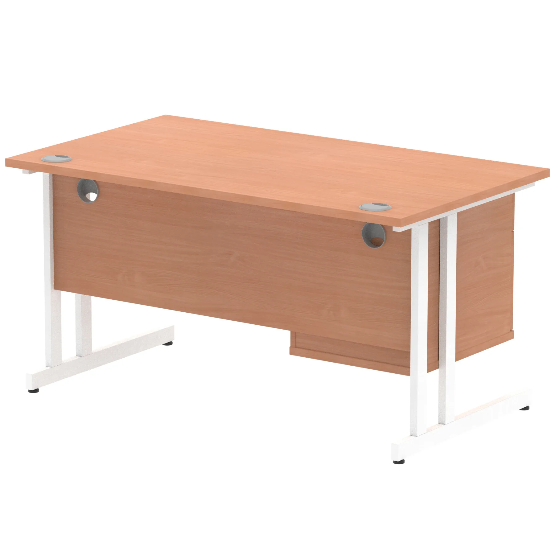 • Impulse contract 1400 wide desk • 25mm tops • Heat resistant Beech melamine finish • 18mm modesty panels • 2mm protective abs edging • White coated double strut legs • 2 cable ports • Height adjustable feet • Steel to steel fixings • 2 modesty panels slots • Deep set modesty panel (5”) allows for compatibility of most screen clamp fittings • Fixed pedestal