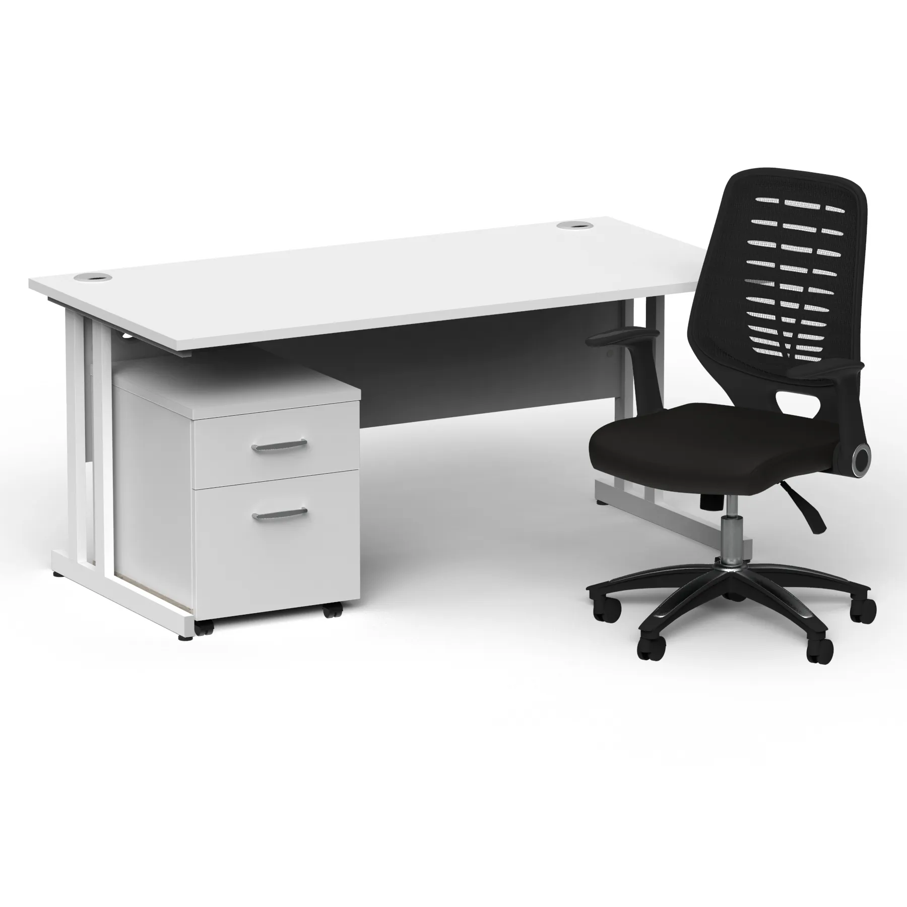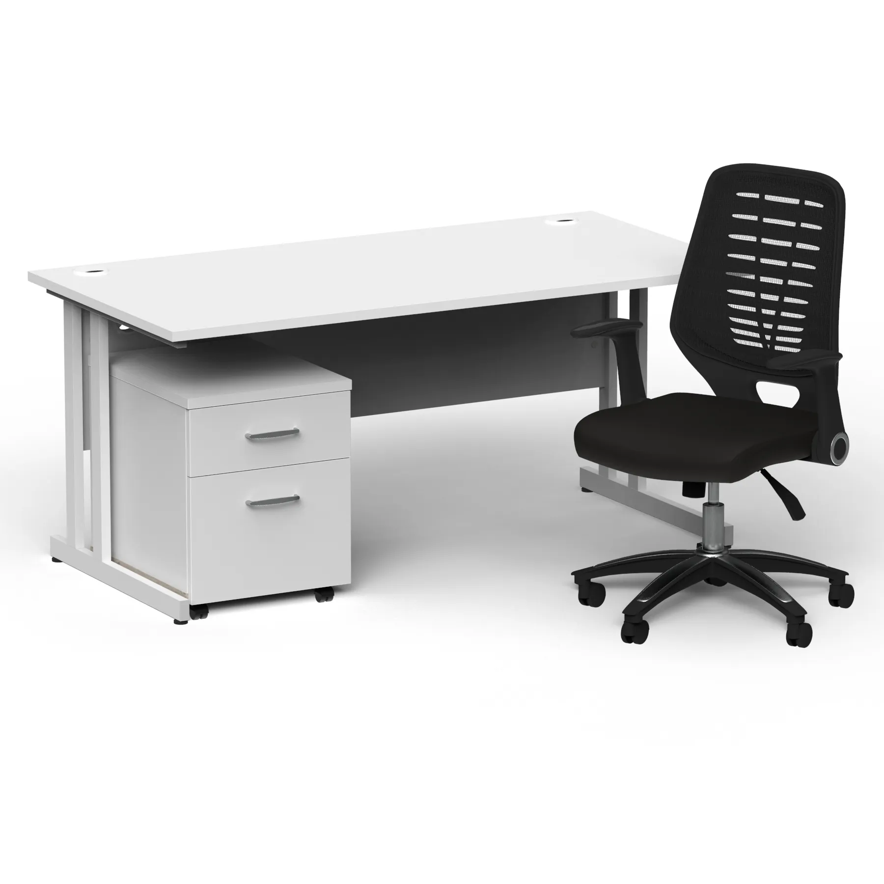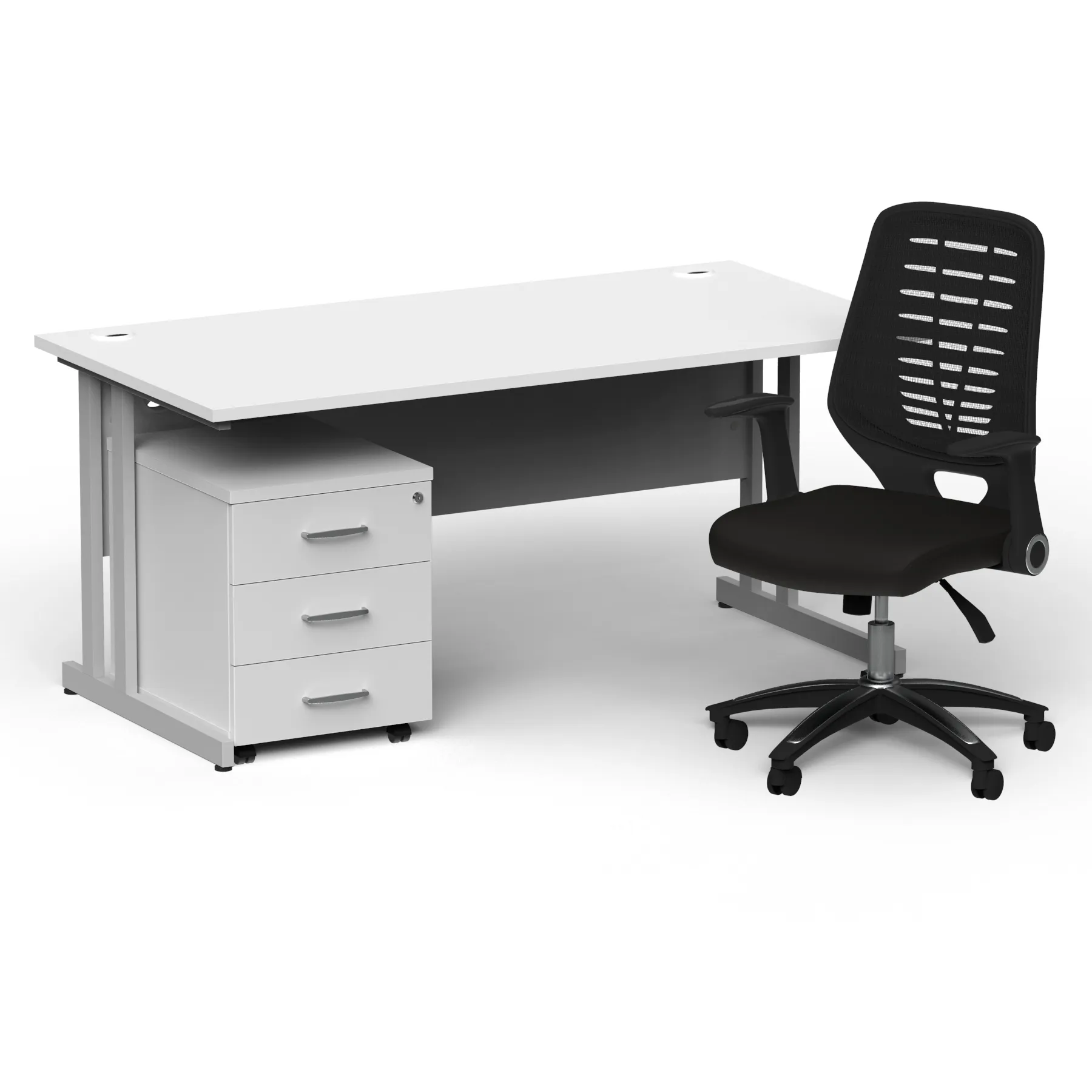 Impulse contract desk | 25mm tops | Heat resistant melamine finish | 18mm modesty panel | Double strut legs | Steel to steel fixings | Impulse mobile pedestal | Steel handles | Smooth running castors for mobility | Lockable drawers | Solid drawer construction | Relay operator chair | Airmesh fabric seat cushion | Soft mesh backrest with stylish design | 2 lever infinite lock tilt mechanism | Weight tension controlled | Fold back boomerang arms | Gas lift tested to 110kg | Usage: 8 hours