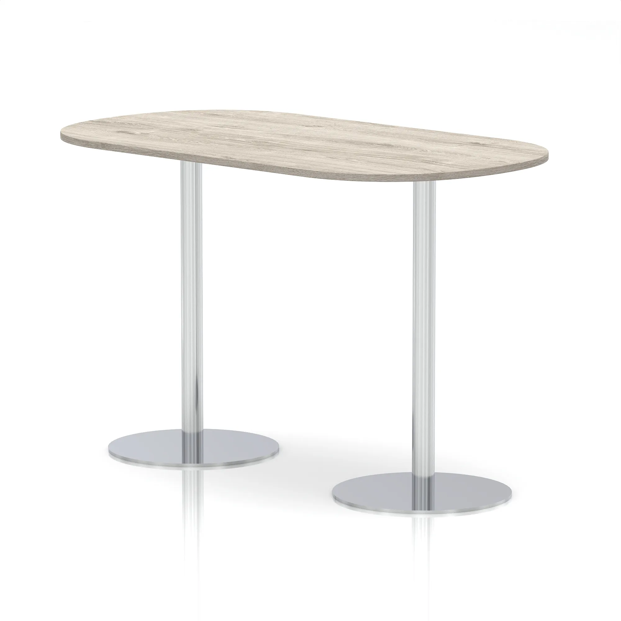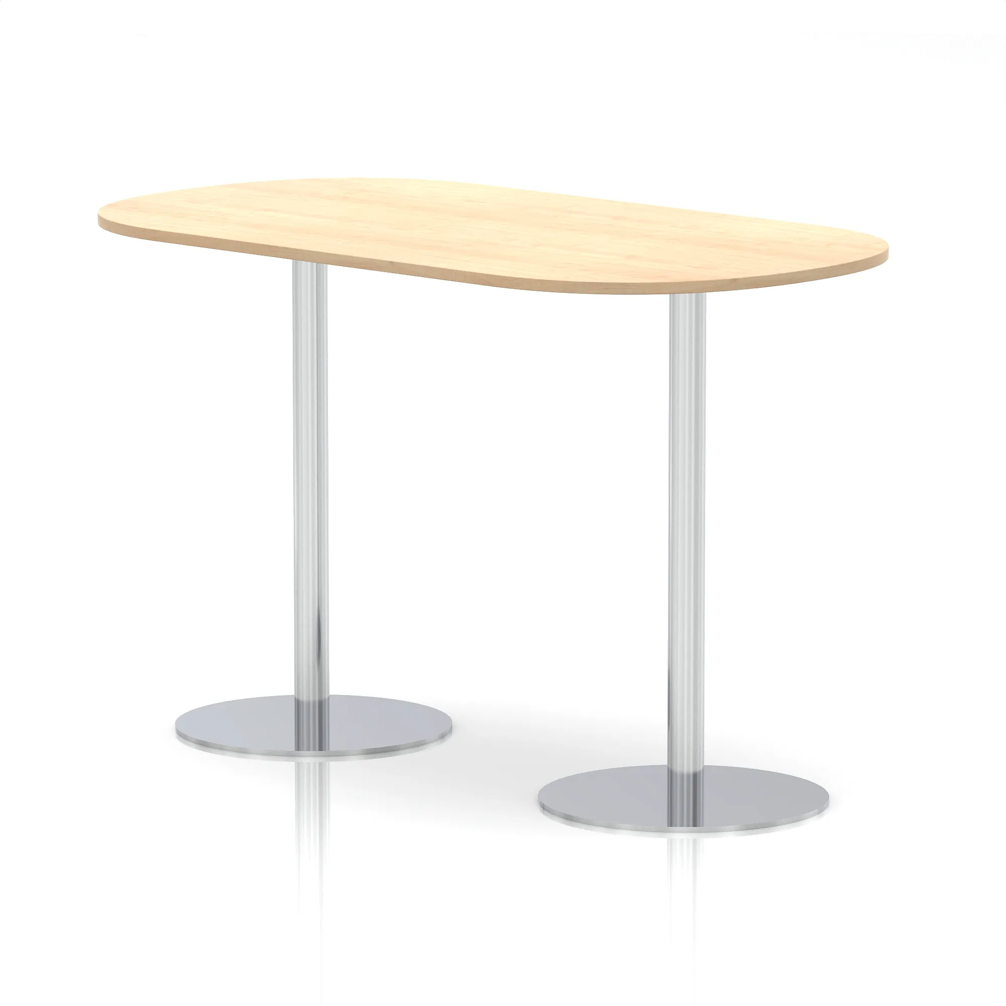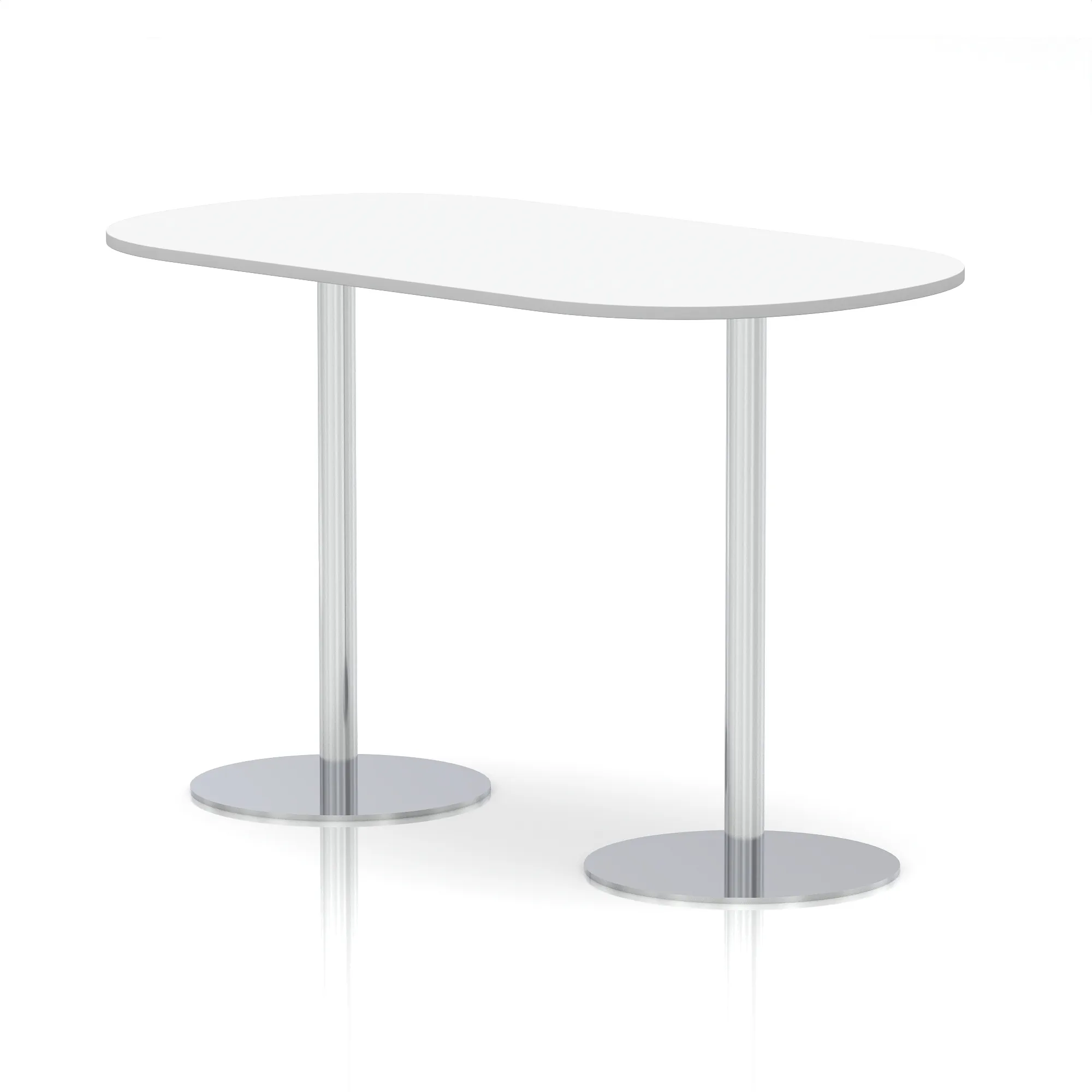 25mm thick desk top profile | Dual, brushed stainless steel effect circular base (580mm diameter) | Brushed stainless steel pillars (76mm diameter) | Weighted base provides stability | Two part bolted frame system