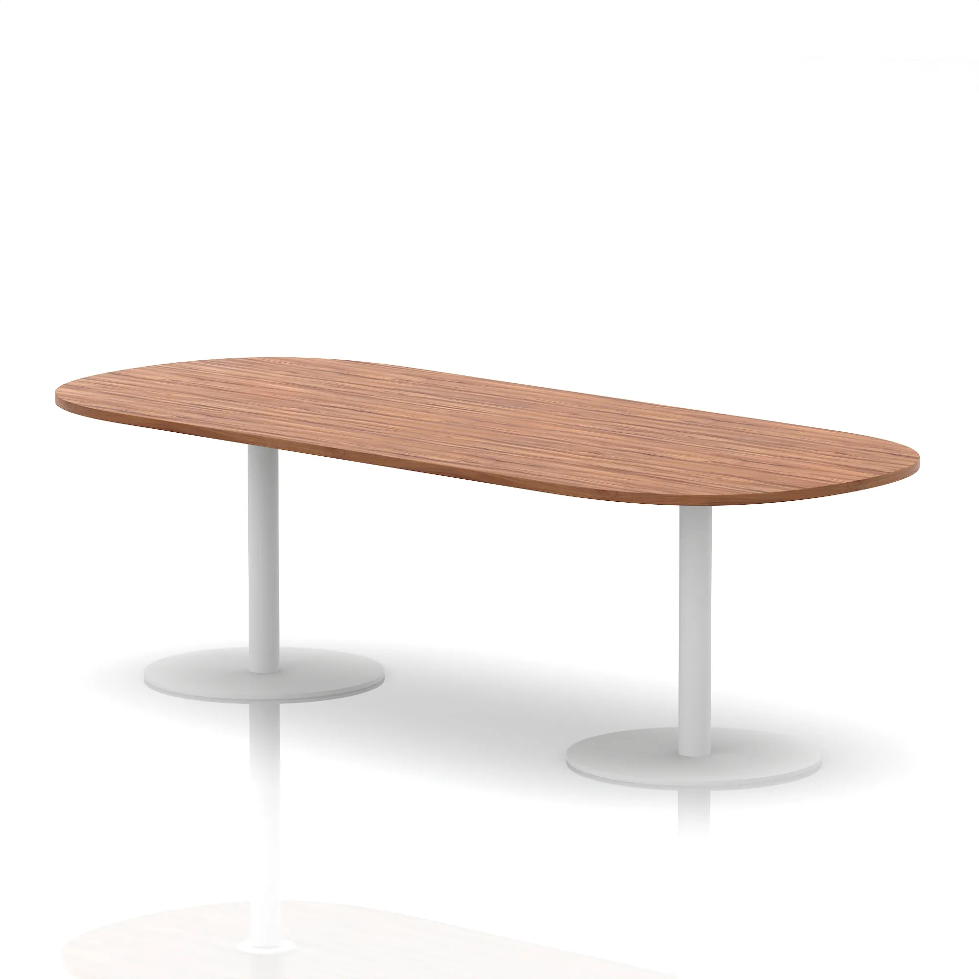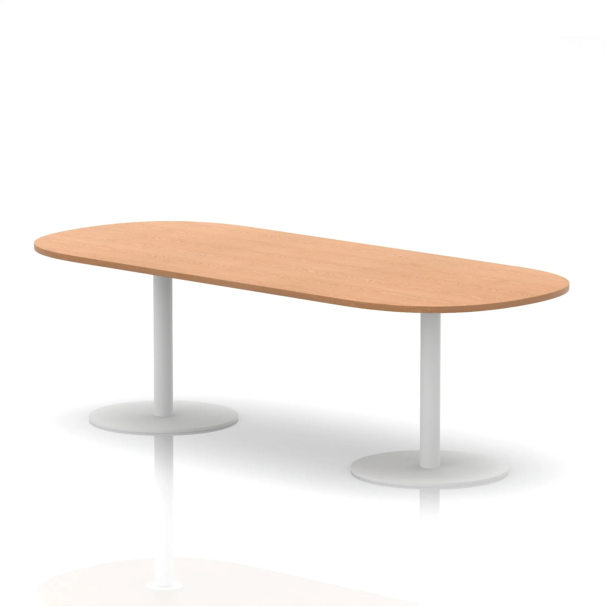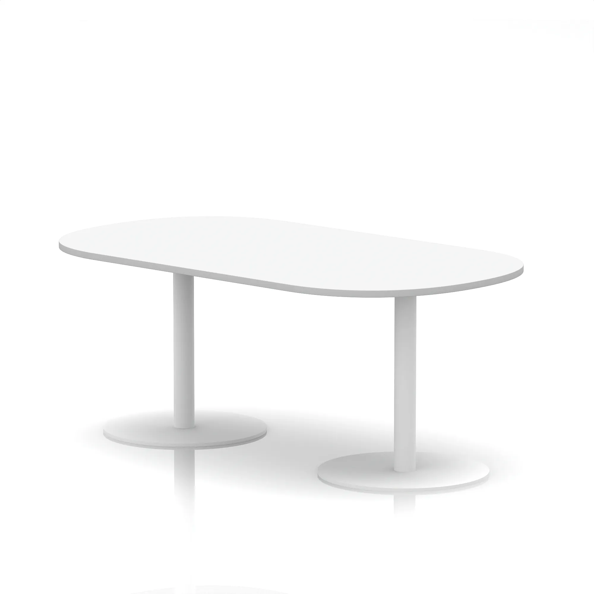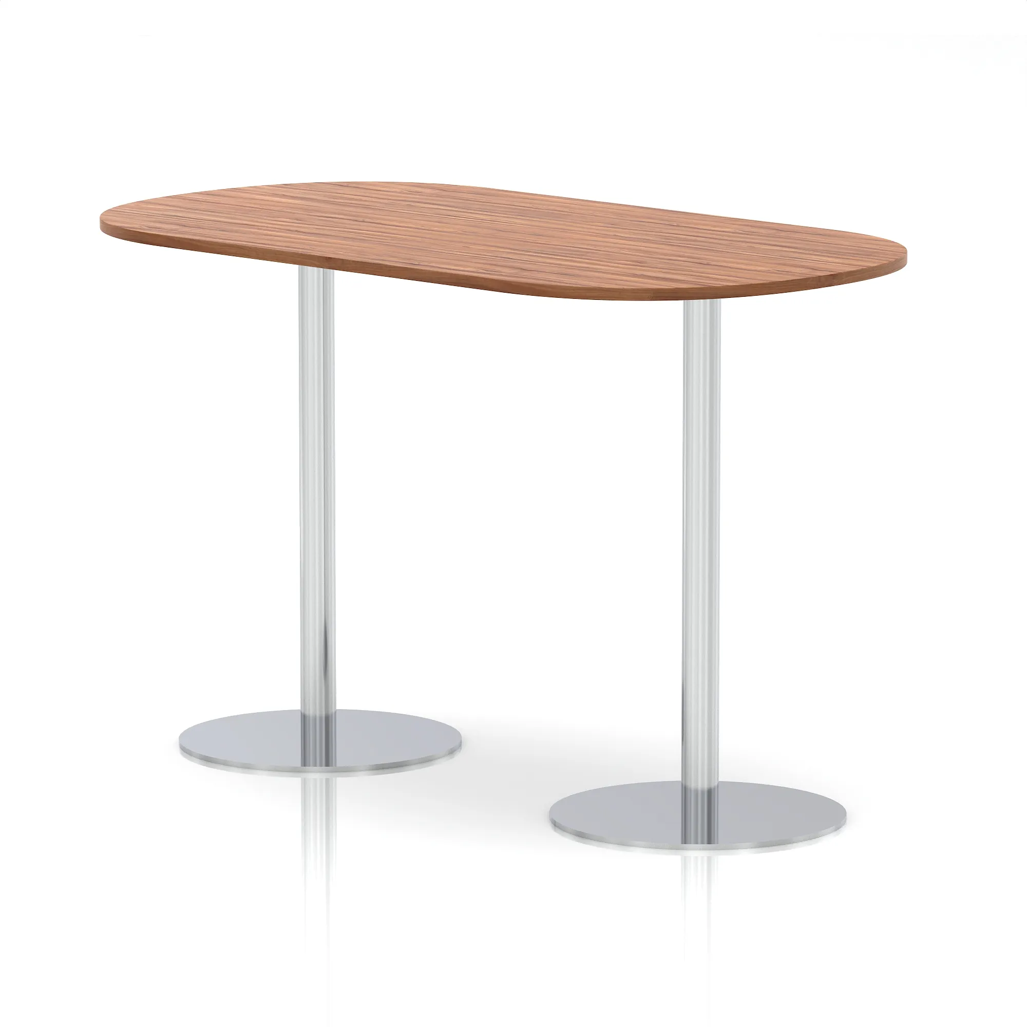 25mm thick desk top profile | Dual, brushed stainless steel effect circular base (580mm diameter) | Brushed stainless steel pillars (76mm diameter) | Weighted base provides stability | Two part bolted frame system
