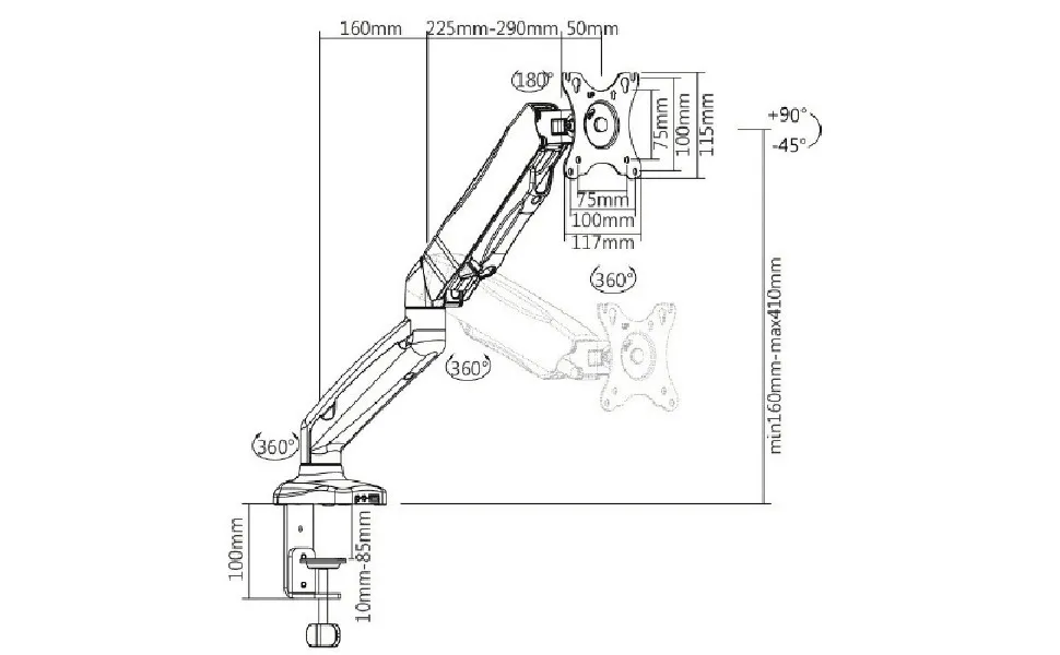 • Tilt up/down 180 degrees, free swivel left/right 360 degrees, 360 degrees rotation, mount the monitor in landscape or portrait orientation