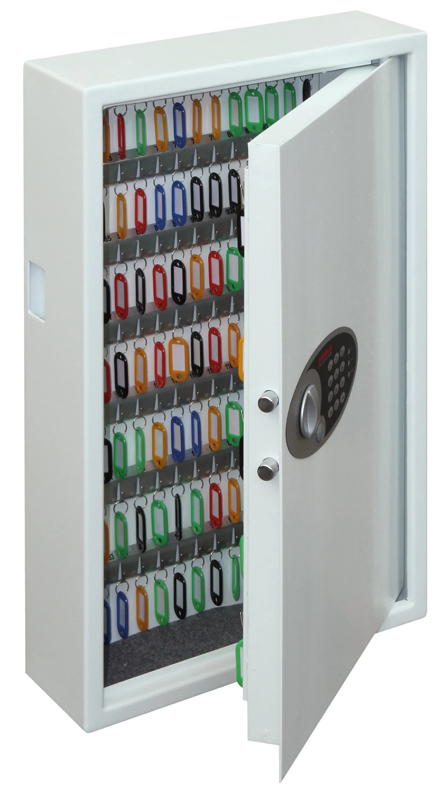 NO OF KEY HOOKS – 30, 48, 144, 300, 500 or 700 | LOCKING – Fitted with an advanced ‘user friendly’ electronic locking with anti-tamper or bounce solenoid locking System. For added peace of mind these safes are fitted with a key override facility should the code be misplaced (2 Keys supplied). | SECURITY – When bolted to a wall these key Safes provide defence against burglaries aimed at stealing car keys, house keys, office keys etc | FIXING – Ready prepared for fixing to the wall with bolts supplied | SPECIAL FEATURES – A unique key deposit slot allows keys to be deposited without the need to open the safe | DEPOSIT SLOT – 55H x 35W x 15Dmm | KEY TAGS – Supplied complete with a selection of coloured key rings | COLOUR – Finished in a high quality scratch resistant paint RAL9003 White.